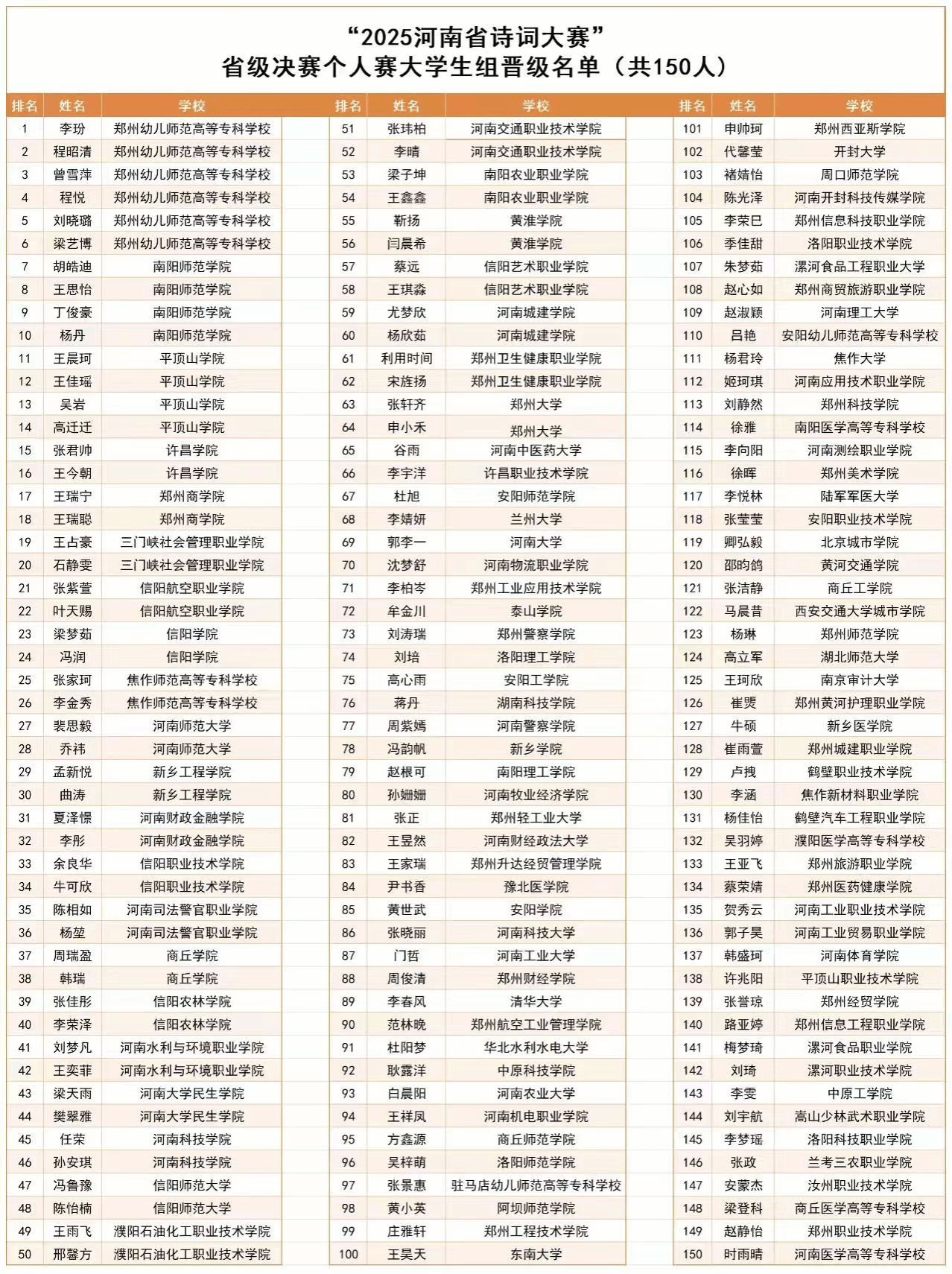 大赛内容以小学、初中、高中语文教材内的诗词篇目为主,并适当拓展,主要考察选手对中华经典诗词的积累、理解、赏析、拓展及运用。基础教学部语文人文教研室教师精心筹备,积极动员学生参与活动,积累古诗词,指导学生在“河南诗词大赛”、“诸葛少年”公众号上学习诗词,进行通关练习。自2025年6月至10月,经过线上海选、初赛和复赛,共有12名学生晋级,我校也首次入围“2025河南省诗词大赛”高校团体赛预选赛,刘梦凡和王奕菲成功晋级省级决赛个人赛大学生组。